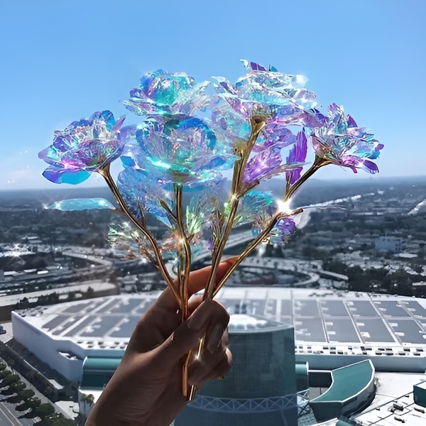Svaka ruža izrađena je s iridescentnim, holografskim premazom koji prekrasno svjetluca na svjetlu, stvarajući sjaj poput galaksije koji je jednostavno očaravajući.