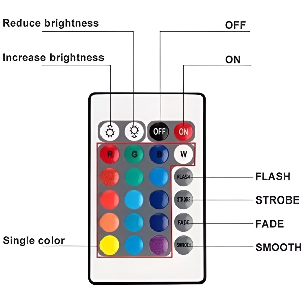 AQUASHEIN dolazi s praktičnim daljinskim upravljačem koji vam omogućuje jednostavno podešavanje rasvjete. Uz 24 tipke, možete birati između 16 RGB boja i četiri dinamična načina rada (bljeskalica, stroboskop, blijeđenje, glatko). Upravljajte svjetlima s udaljenosti do 10 metara, osiguravajući prilagodbu bez muke.