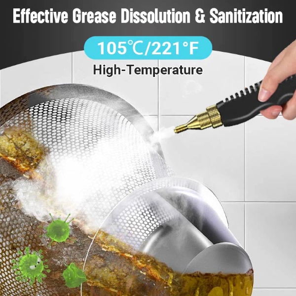 Nazivna snaga od 1600W stvara paru do 105℃ za manje od 10 sekundi, uklanjajući masnoću, prljavštinu, prašinu i mrlje s različitih površina brzo i učinkovito.